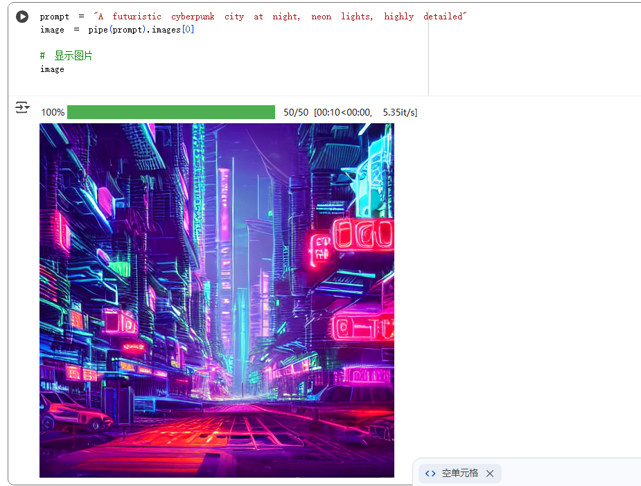 prompt = "A futuristic cyberpunk city at night, neon lights, highly detailed"