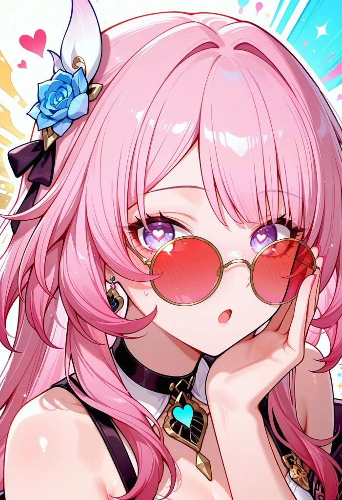 cyrene (honkai: star rail), :o, adjusting eyewear, pink hair, pink nails, purple eyes, hair ribbon, heart, heart-shaped pupils, jewelry, long hair, parted bangs, thin gold framed sunglasses, portrait, abstract background, bare shoulders, blue flower, blue rose, blush, colorful, solo, symbol-shaped pupils, tinted eyewear, two side up, upper body, earrings, choker, black choker, ribbon, sparkle, flower, straight hair, red-tinted eyewear, sidelocks, looking over eyewear, hand on own face, glasses, round eyewear, open mouth,